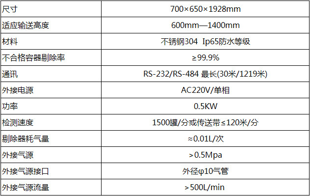我公司以上三款檢測機和剔除器可實現高度、寬度調節,并自帶高度數字顯示器,操作簡便。內部程序最多可存儲10種產品數據,能實現一條生產線上不同罐型、瓶型的檢測及剔除。